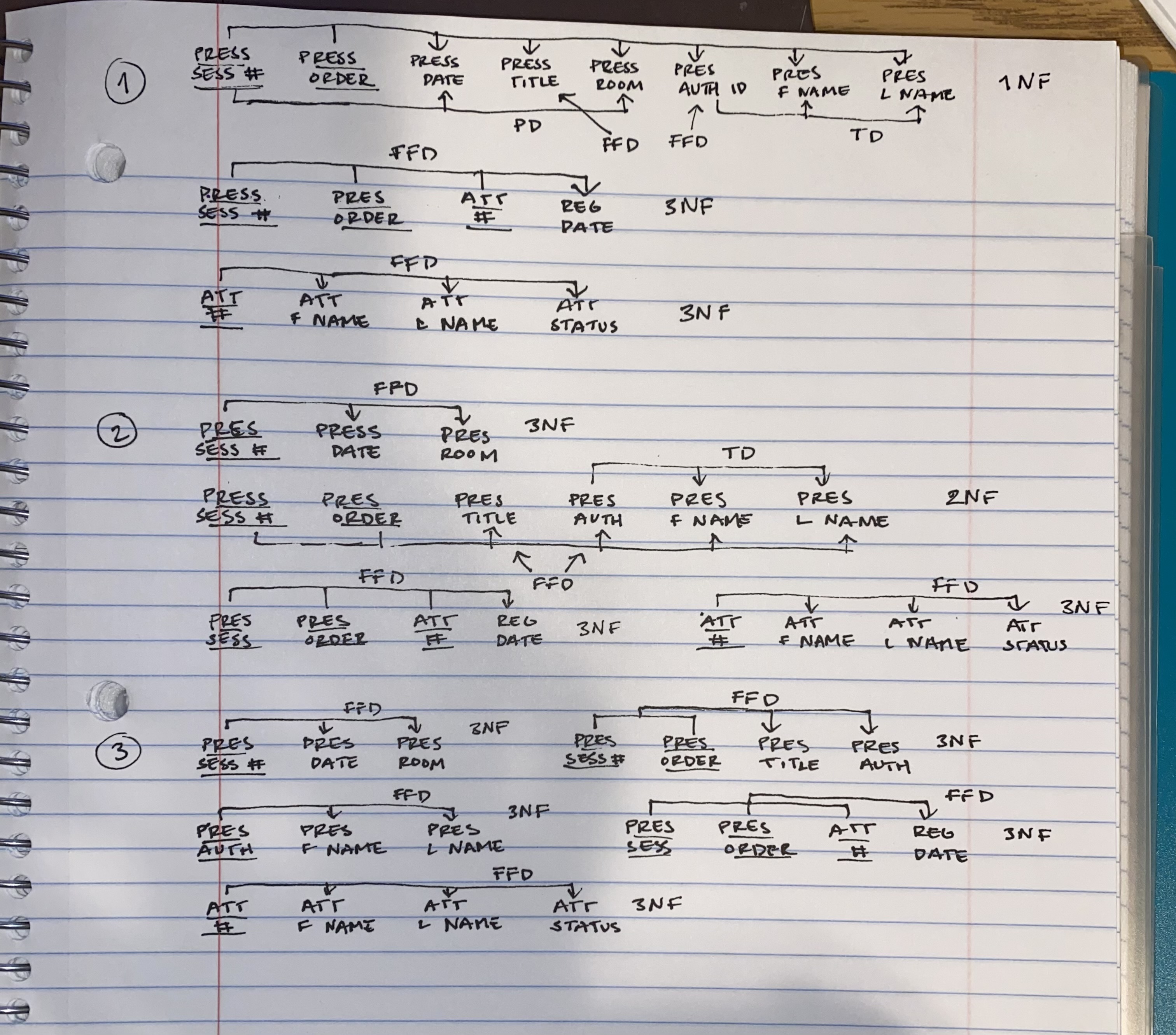 This picture demonstrates a few examples of the step-by-step transformation of datasets from First Normal Form (1NF) through Third Normal Form (3NF). Within several practice problems, it highlights how functional dependencies are identified and resolved to eliminate redundancy, improve data integrity, and ensure efficient database structure. Each stage visually breaks down attributes, keys, and dependencies, showing how complex data can be decomposed into well-structured relational tables. This work reflects a strong understanding of normalization theory and its practical application in designing scalable and maintainable databases.